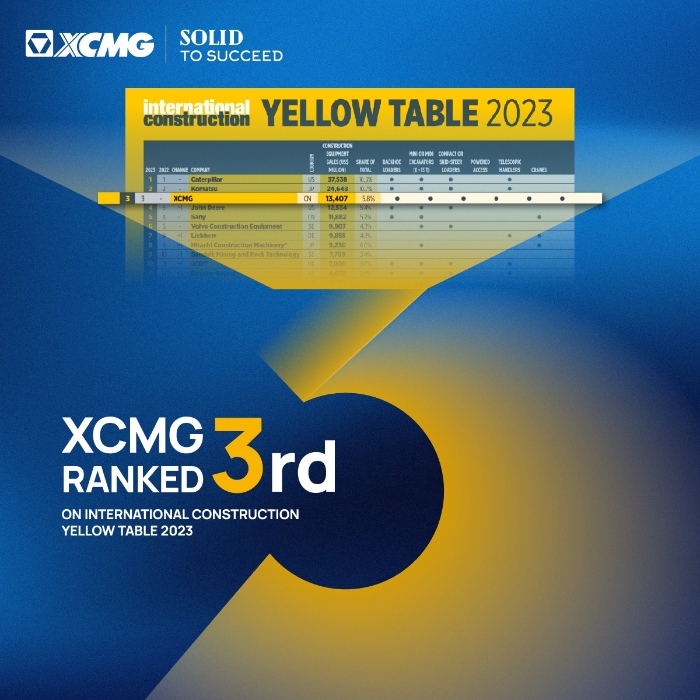 XCMG has ranked No. 3 among the world's original equipment manufacturers (OEMs) in the latest Yellow Table published by International Construction Magazine, a subsidiary of global construction media company KHL Group. XCMG has maintained the top three rankings for three consecutive years.